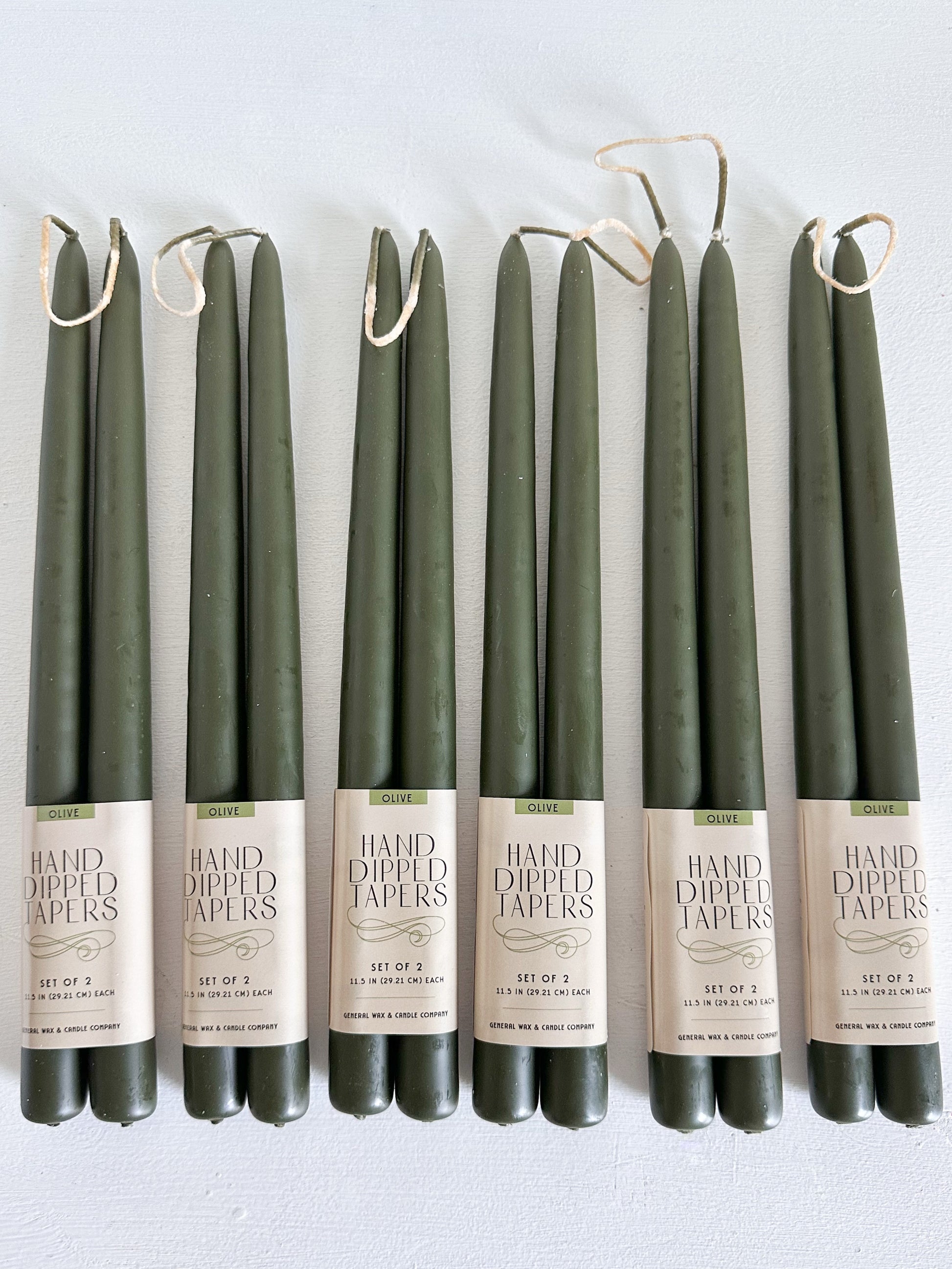 12" Artisan Crafted Connected Wick Taper Candles – Clean Burning - Hand-Dipped Elegance in Olive – Made in USA.